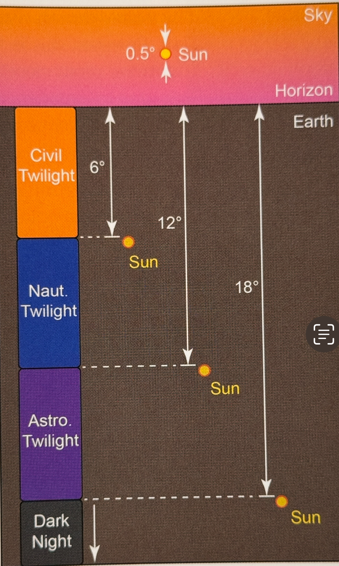 - Astronomical: sun is between 12 and 18 degrees below horizon.
